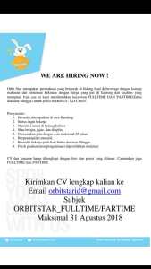 Kirim lamaran lengkap/CV ke : Alamat email ini dilindungi dari robot spam. Anda memerlukan Javascript yang aktif untuk melihatnya. dengan subjek ORBITSTAR_FULTIME/PARTIME